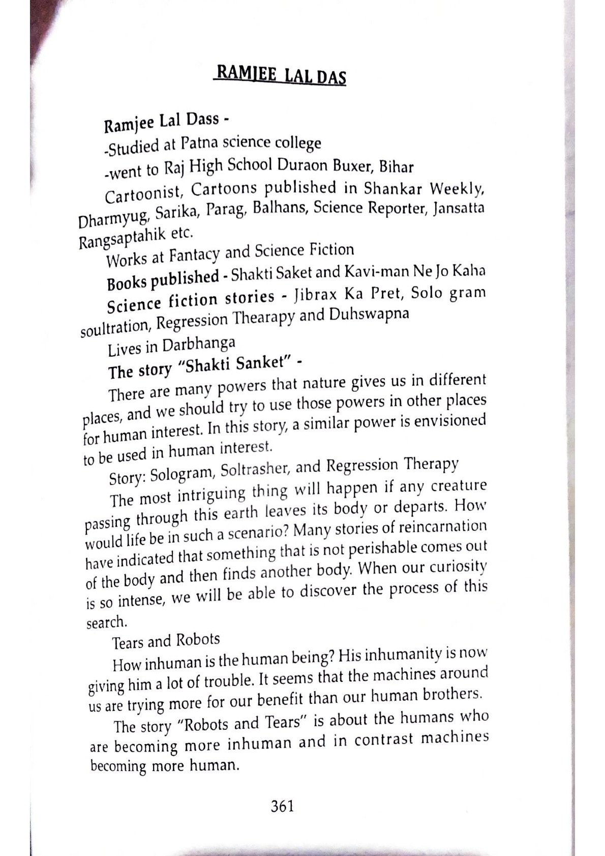 His published works include story collections such as Shakti Sanket, Robot Aur Aansu, Jibrax Ka Pret, Sologram, Regression Therapy, and Duhswapna, all of which reflect his fascination with human nature, mystery, and the unseen forces that shape existence. Living in Darbhanga, he continues to be celebrated for his creativity, originality, and enduring contribution to Indian science fiction and cartooning.
