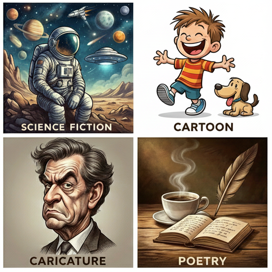From sci-fi tales to vivid caricatures, each piece tells a story.