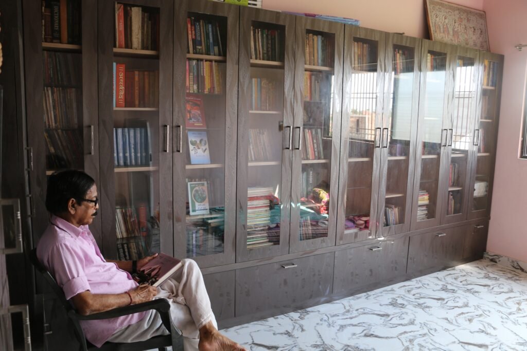 Rooted in the rich soil of Belarahi, Madhubani (Bihar), Ramjee Lal Dass Trikaldarshi‘s mind travels effortlessly through time and space, proving that with enough imagination, a library is the only spaceship one needs. Seated most often in a humble chair, the author is absorbed in a book, framed by a Wall of Worlds: a towering, glass-fronted archive behind him that stands as a physical testament to his multifaceted artcraft. Its ordered rows reveal a mind devoted to structure even as it probes the chaotic “unseen forces that shape existence.” This quiet moment of stillness contrasts sharply with the kinetic energy of the cartoons that have appeared in reputed publications. It is a rare glimpse into the input phase of a creator known for his output. He is likely decoding a new mystery or finding a satirical angle on human nature, proving that the journey to the extraordinary often begins in a quiet corner of a room in Darbhanga.
